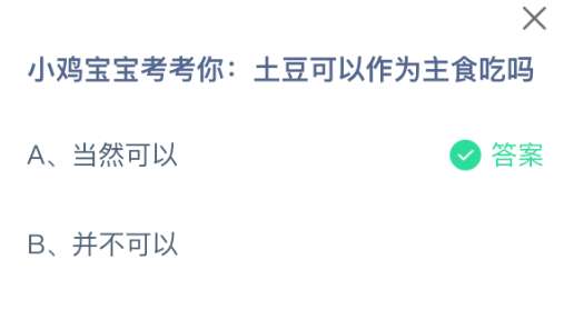 以上就是小鸡宝宝考考你:土豆可以作为主食吃吗,支付宝蚂蚁庄园2025年12月22答案最新,更多精彩内容,请点击关注pk游戏网更新!