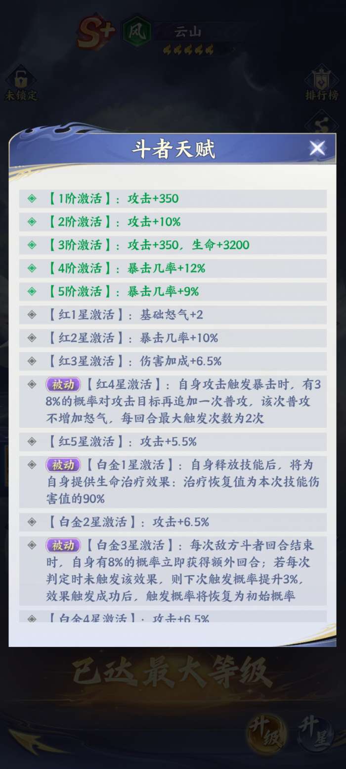 斗者天赋将极致输出,还有生存续航全部放在一起,从1阶到5阶,暴击率,还有攻击力都会稳定的提升。在红四星时暴击触发之后,还会有38%的概率追加一次普通攻击,每一个回合最多触发两次,让输出的效率就可以成倍的增长。在白金一星时释放技能之后,那就可以直接恢复本技能伤害大约90%的生命值,让他在战场中就可以越战越勇。白金三星的额外回合机制就能让他有机会在瞬息万变的战局中,可以抓住转瞬即逝的战机,然后去扭转乾坤。