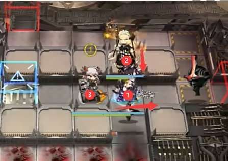 根据图示将【①煌】部署向右,【②夜莺】部署向下,【③塞雷娅】也一同部署,然后将其挂机即可。
