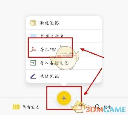 1、在云记首页的下方中间可以看到黄色的+选项,点击它会弹出这些选项,然后选中【导入PDF】;