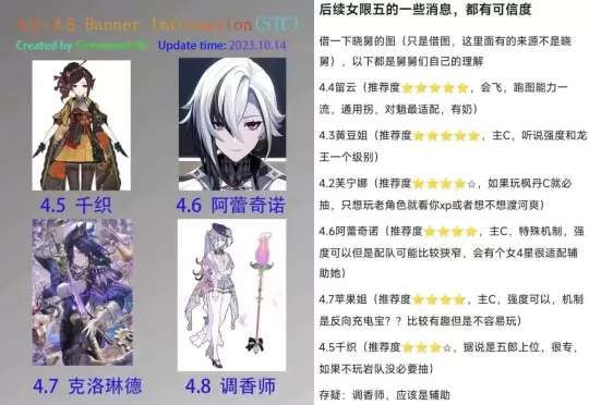 然后就是4.4的留云了,据舅舅们爆料,推荐度非常高。可以飞行且跑图能力非常出色,同时也是通用的支援角色,非常适合与魈搭配。说是售后队友也不为过。至于4.5卡池登场的新角色千织貌似是五郎的上位,很专,如果你不打岩队,可能不太建议你去抽。