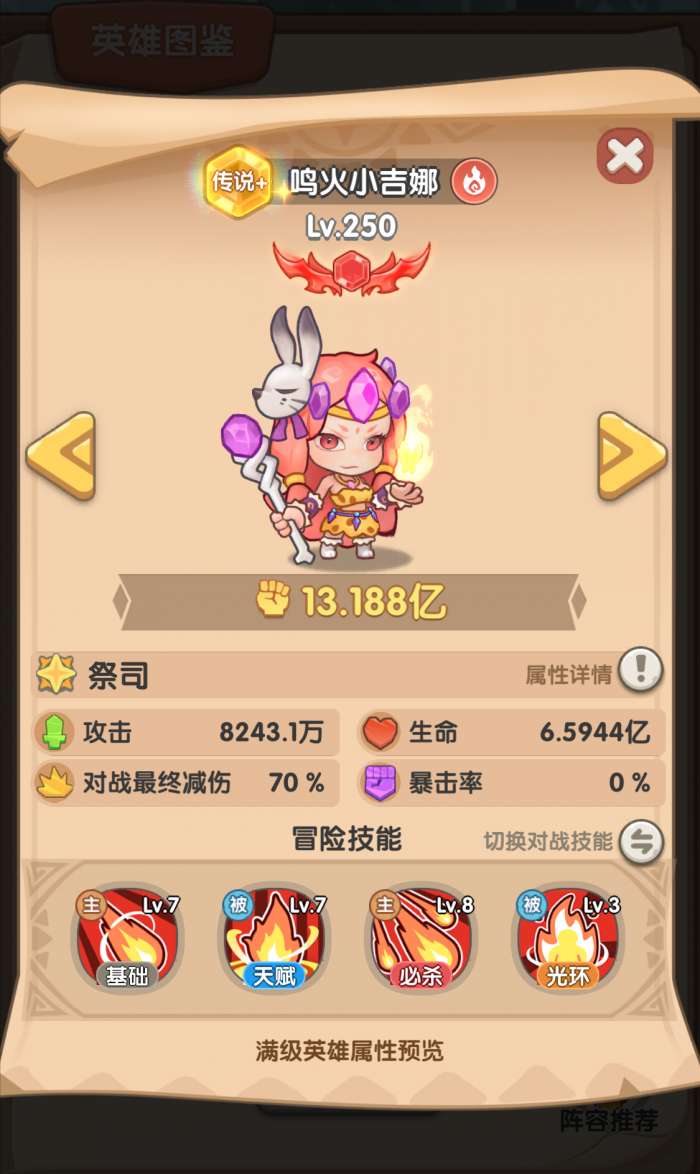 美丽动人的鸣火小吉娜,在火系中处于稀有传说的地位。小吉娜以全屏伤害和强控效果为主,在突破14星的限制后,伤害强度和范围均有进一步提升。另外,升至16星后,还可以提供不限种族属性的增益。