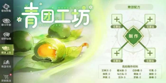 “青团寻芳”为配套兑换系统,依据玩家在“青团工坊”中成功解锁的青团种类数量,开放对应档位福利领取。两模块联动设计,形成“制作—解锁—兑换”的正向反馈链,显著提升整体资源转化效率。