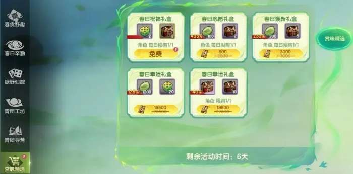 “赏味精选”提供多层次礼盒供给。每日限领一次春日祝福礼盒,内含踏青骰子与全材料随机包;同步开放多档付费礼盒,其中春日幸运礼包第二种直赠梦幻女孩时装,为外观党提供确定性获取路径。