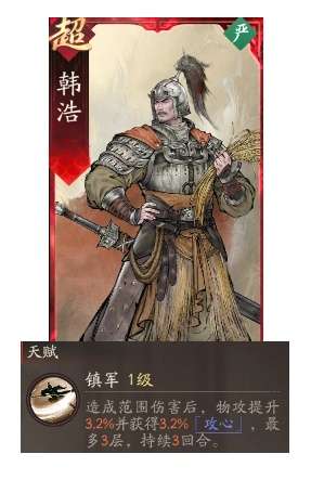 韩浩:能被<当锋摧决>和<铁马破阵>触发,数值较高持续回合也长,不用夏侯惇的话可以给张辽。
