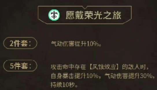 2、5件:攻击命中存在【风蚀效应】的敌人时,自身暴击提升10%,气动伤害提升30%,持续10秒。