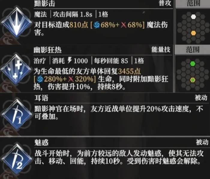 黯影神官作为支援类型的角色,如果在战斗的话,玩家需要将其放到中后排。因为 boss释放群体攻击的时候,很有可能会波及到他,一旦他自身受到了伤害,在战斗的时候肯定是会受到对应的影响,这样也会对后续的战斗产生影响。另外在资源方面的话,其实玩家如果手中的资源足够丰富,可以先将其分配给暗影神官的魔力跟攻击力方面的属性,一旦这两个方面有了对应的资源之后,能够让其护盾的厚度跟增伤的效果有所增加。暗影神官在战斗的时候,还需要搭配核心的武器,像黯影之杖。另外在防具跟饰品方面的话,也能够有效的让其生存能力跟团队的增益效果得到提升。