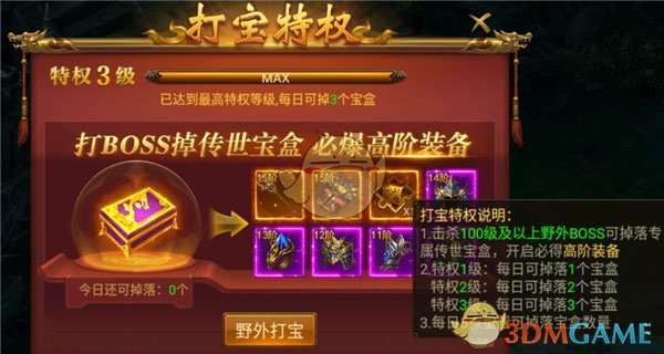 激活打包特权后,在野外BOSS地图挂机,可掉落宝盒,随机开启获得装备or碎片。