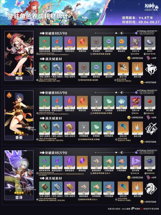软件提交 专题合集 热门手游hi各位旅行者们大家好呀,本期为大家带来4.8版本下半卡池角色的养成耗材统计图鉴,有养成需求的旅行者们可以开始着手准备啦!