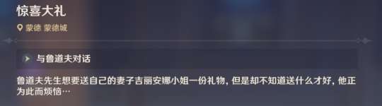 领取?委托〔惊喜大礼〕后,来到蒙德城找到鲁道夫,回答他有关骑士团手册的问题,帮鲁道夫找各个店铺的老板准备礼物