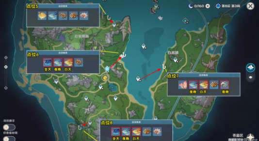 注:鱼类出没时间全天为24小时出没,白天为6:00-18:00出没,夜晚为18: 00-6:00出没。