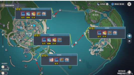 1、枫丹廷北部共四处钓鱼点,位置如下。