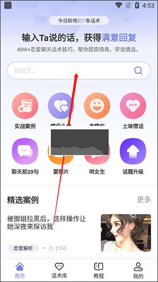 软件提交 专题合集 热门手游恋小帮怎么搜索话术,进入恋小帮app,点击最上面的搜索栏,输入你要回复的话,点击搜索,现在就有很多话术出现了。赶快去APP里搜索你想要的话术吧。