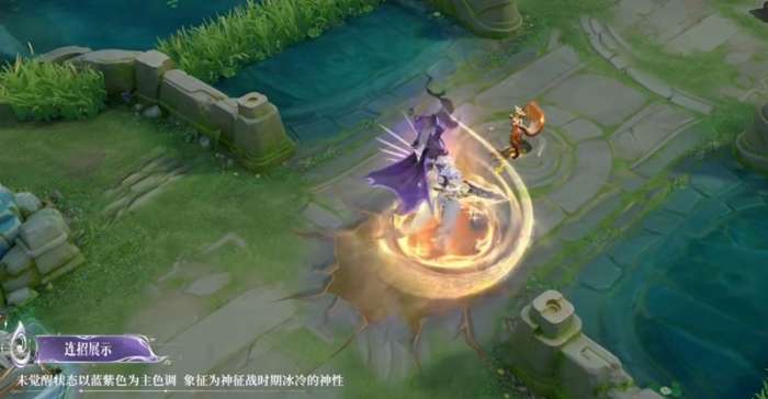 未觉醒状态:掷出由多把小剑组成的剑阵,命中瞬间展开形成圆形剑牢。真身觉醒状态:战神之铠携剑阵冲出,在敌方阵营中进行数次瞬移挥砍。