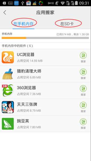 6、点击后,选择【手机内存】或【在SD卡】根据需要来选择,这里是将手机搬家到SD卡上