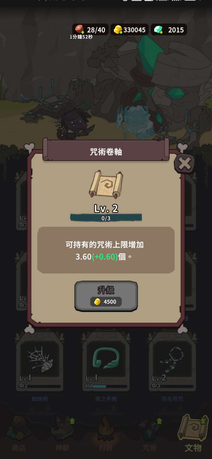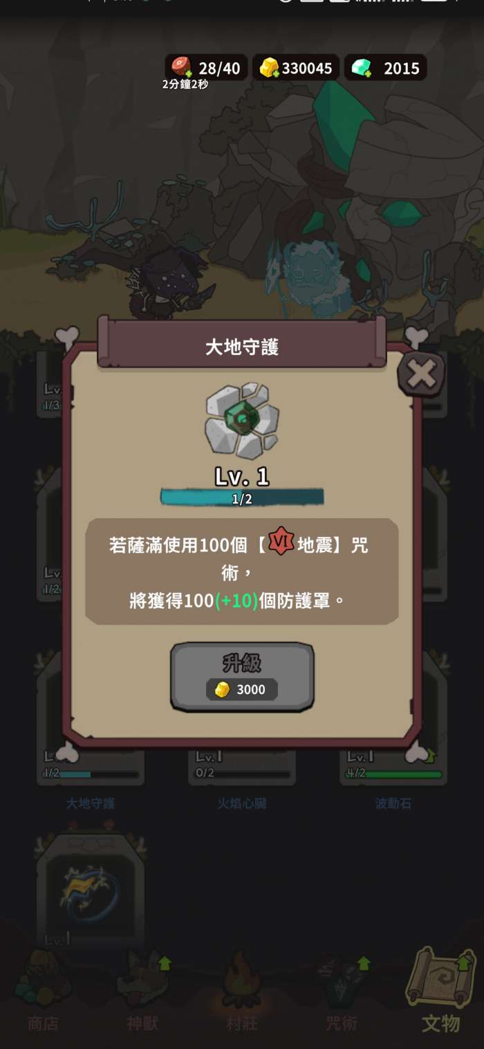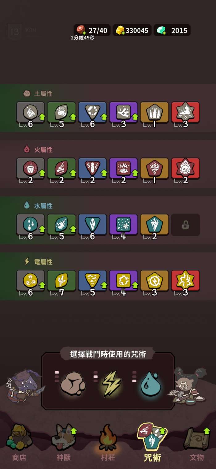 强化时先同步强化神兽等级(增加猫的灵魂产量以及仓鼠技能的爆发强度)和电系咒术等级。神兽等级强化至七级左右,电系咒术等级强满(约35波左右)后开始强化土系咒术。