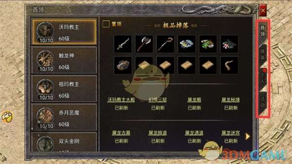 前期装备主要从完成首领boss(个人首领、玛雅神殿、幻境地图、特权地图等)挑战获得,越高级的首领爆出的装备等级属性越强。