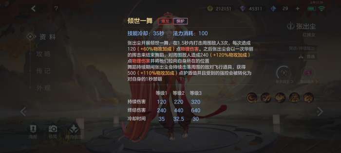 张出尘开展倾世一舞,在1.5秒内打击周围敌人3次,每次造成120(+100/lv)(+60%物攻加成)点物理伤害。之后张出尘会以一次华丽的挥击来结束舞蹈,对周围敌人造成240(+200/lv)(+120%物攻加成)点物理伤害并将他们拉向自身所在的位置。