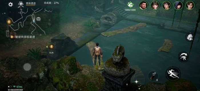 这个任务位于西王母国的雨林遗迹当中,玩家可以先将自己传送至雨林遗迹章节,跟随引导前往林地。在此处可以看到几个有石头搭建而成的桥梁,如小编在下图所展示,此时建议玩家带上吴邪并解锁罗盘装置,吴邪这一角色的解谜性能更佳,可以说是专业的解谜担当,而且解锁罗盘道具后,可以让吴邪解谜的成功率在提升20%,玩家穿过小河,然后跳跃过两座山石之间,就能够看到隐藏在山石后,水面上的漂浮宝藏箱。