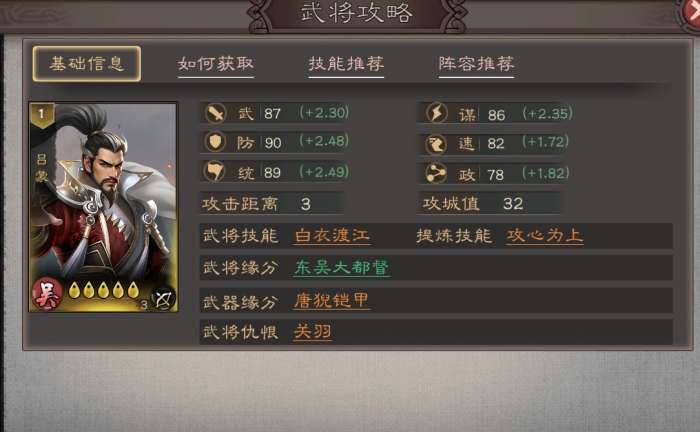 • 效果:牺牲自身普攻,提升谋略攻击伤害(受谋属性加成),且每回合对敌军单体发动谋略攻击,适配吕蒙纯谋略输出的定位,进一步放大伤害能力。