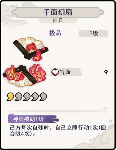 「千面戏子」是设计上非常自洽的角色。专属卡牌「扶摇之舞」为己方全体施加「灼烧」,真气技触发己方全体的灼烧,触发自残,激活神兵被动,使「千面戏子」多次行动,造成伤害。