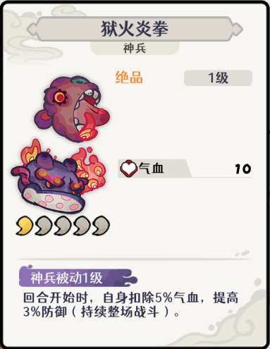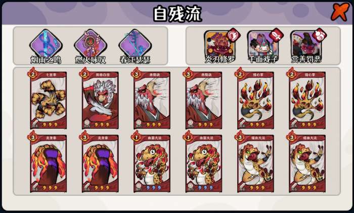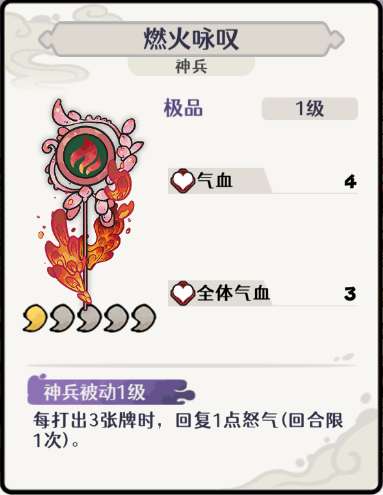 专属卡牌「炎刃斩」只要1点怒气就能为全体施加「灼烧」,神兵被动也是自残。十分契合自残流,可以说是自残流的专属豪侠。
