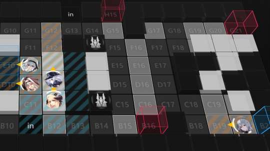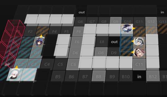 请注意双鲨的朝向,为了避免在双鲨处将安多恩的答辩打出来而导致伤害,需要控制好输出。首次施放绝影技能,请在F6放置;第二次施放绝影技能,请在D8放置。歌蕾蒂娅需要部署在D12,夜莺需要部署在C12。