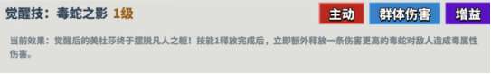 描述:觉醒后的美杜莎终于摆脱凡人之躯!技能1释放完成后,立即额外释放一条伤害更高的毒蛇,对敌人造成毒属性伤害。
