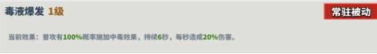 描述:普攻有100%概率施加中毒效果,持续6秒,每秒造成20%伤害。