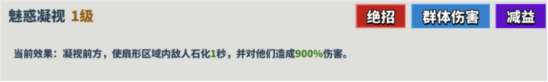 描述:凝视前方,使扇形区域内敌人石化1秒,并对他们造成900%伤害。