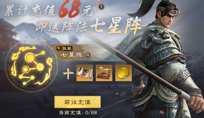 除了赵云以外,还有金铢、百将谱、百将录等资源,这个活动简直值到爆表。除了首冲外,这边还有个累冲(其他活动充值可累积),对于有68元以上氪金预算的人,这个活动简直就是白送(七星阵是技能系阵法,队伍可直接成型)。
