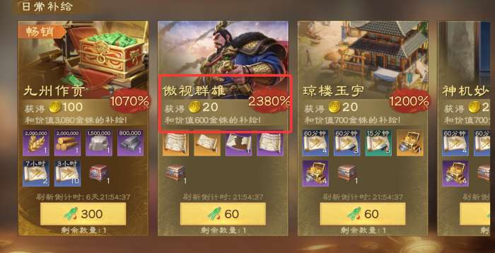 日常补给会有各类物品,前期缺少资源、想加快进度的,可以购买九州作贡;此外就是前期会比较需要百将录,如果有傲视群雄,也可以购买。由于初期的建筑等级对于发育十分重要(做章节任务也很快),其他补给可基于需求灵活选择,大家可以关注下返利比例,1200%以上就不错了。