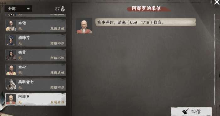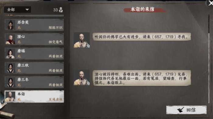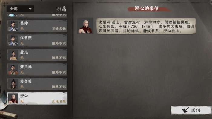 出现江湖故事:好学游僧,跟随指引完成任务后获得澄心的推荐信