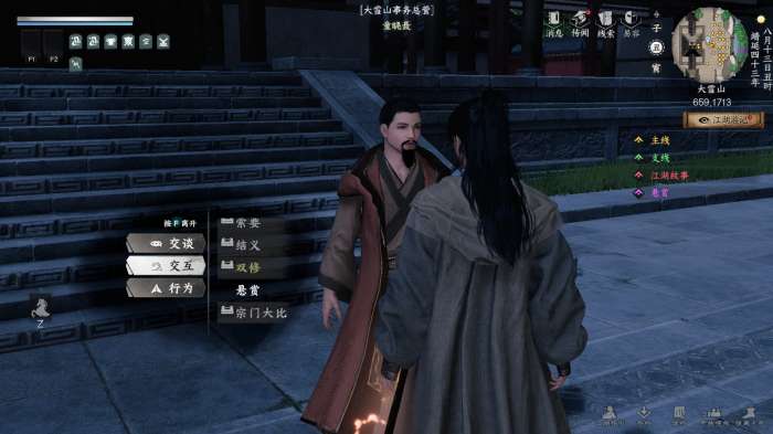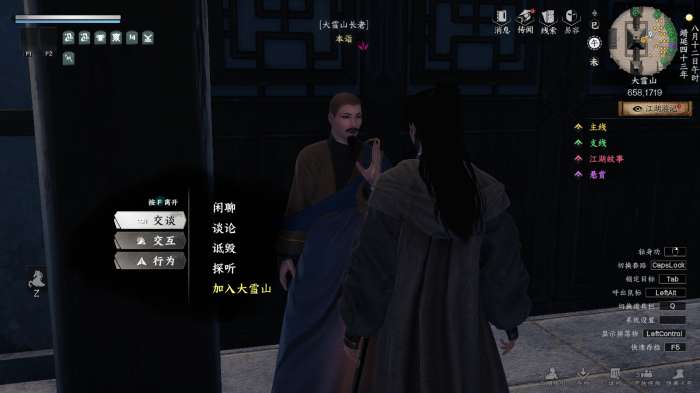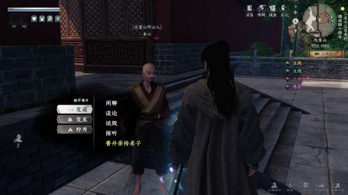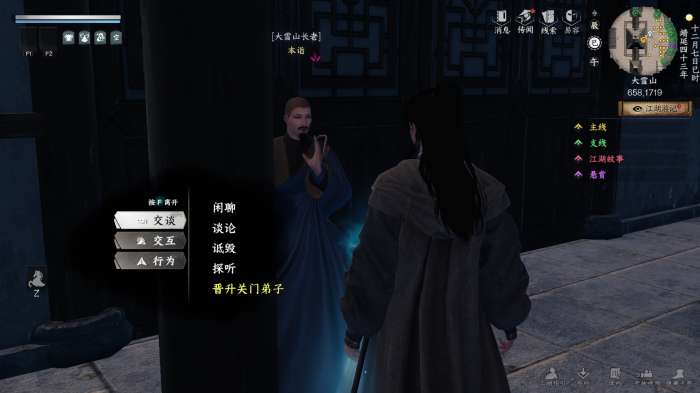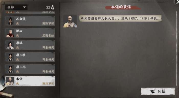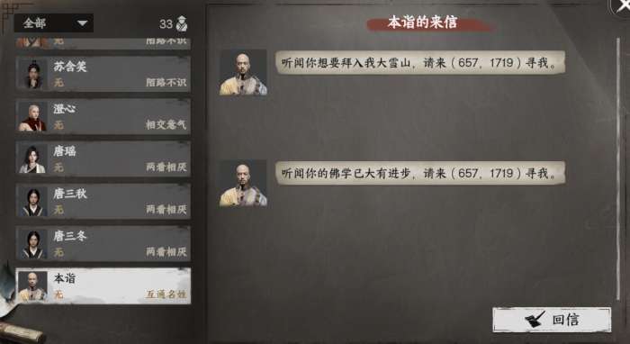 完成江湖故事好学游僧后收到本诣飞鸽后来到657.1719交谈本诣加入大雪山后加入