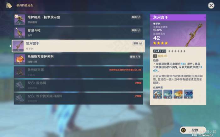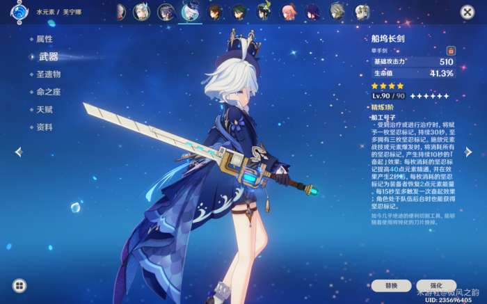我们可以选择通过钓鱼在枫丹获得的灰河渡手,也俗称为水管。这把武器可以为芙芙提供充能和战技提升,非常适合她,是一把四星武器(外观也很符合她)。