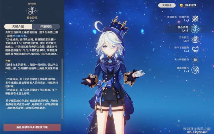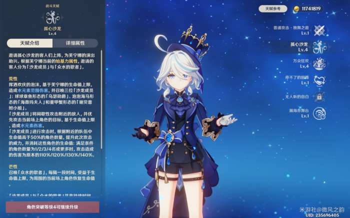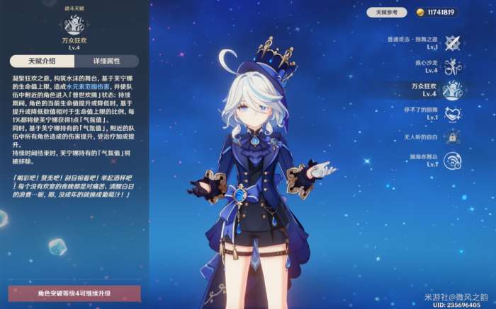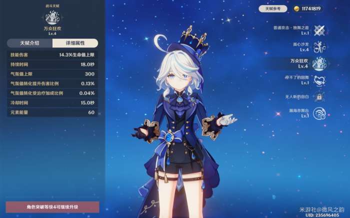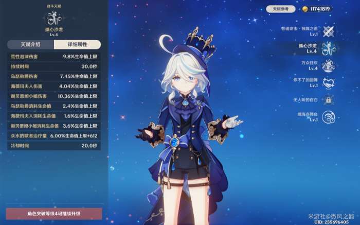 芙宁娜可以在释放元素爆发瞬间对敌方造成部分伤害,并且在持续时间内为队友提供增伤和治疗双提升。需要注意的是,气氛值的计算基于队伍中角色回血或扣血情况。由此可以看出,芙宁娜更适合搭配那维等角色使用,因为需要角色的血量下降并提升,而在某些队伍中可能无法很好地实现这一过程。