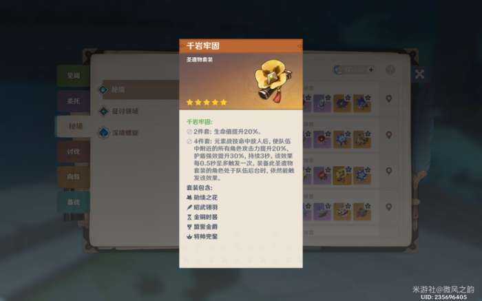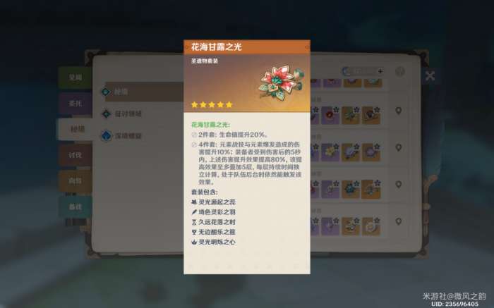 作为辅助,我们可以为芙芙选择2+2的装备方案,这意味着我们会优先考虑增加其生命值的圣遗物套装效果。当然,具体的词条选择也需要根据我们为芙芙选定的武器来做相应的调整。