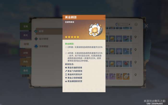 圣遗物套装的选择可以分为输出型和辅助型两种。输出型选黄金四件套,可增加芙芙战技的伤害。在选择圣遗物的词条时,需考虑到我们给芙芙佩戴的武器类型,例如专属武器芙芙可选择暴击头等词条。