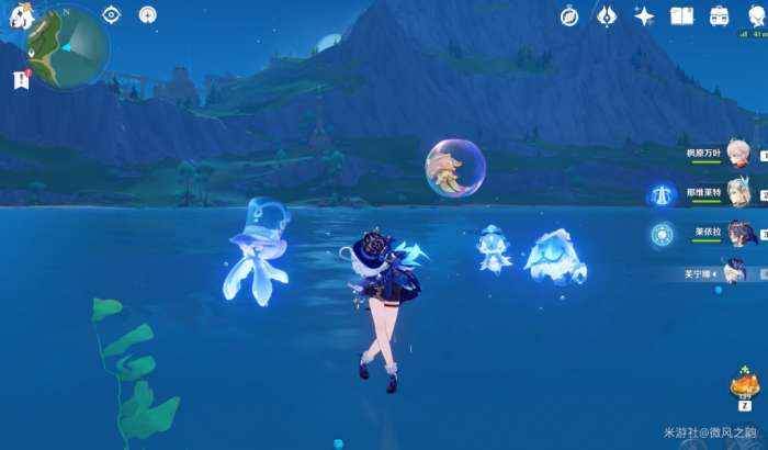 同时,芙芙的战技可以让她在一段时间内在水面上奔跑和行走。如果需要切换到水下,我们可以切换角色。当想回到水面上行走时,我们可以再次切换到芙芙。
