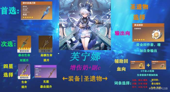 主词条选择:头部:暴击/爆伤 杯子:生命值/水伤 沙漏:生命值/充能