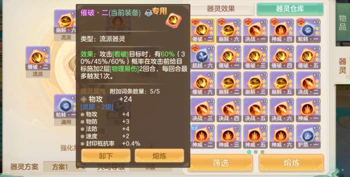 器灵可使用其他器灵以及器灵经验石进行升级,升级后的器灵不仅会增加基础属性以及强化特殊效果,并且会增加词条数量,更有概率获得灵犀属性,获取更多增益效果。