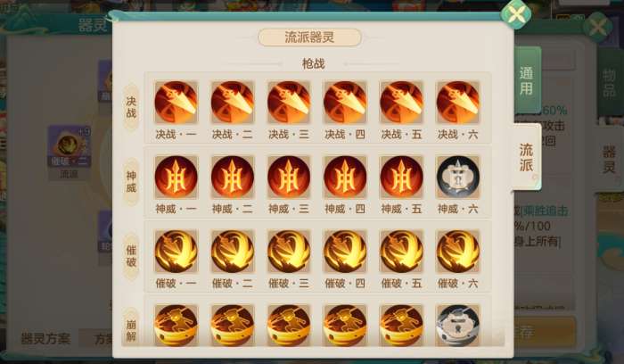器灵分为流派器灵以及通用器灵两种,随着等级的提高最多可装备六个器灵,分别是四个流派器灵以及两个通用器灵,少侠可根据自己的需要去搭配合适的器灵方案。