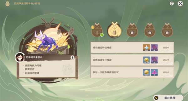 ● 每关斗虫挑战均有「切磋」、「专注」、「倾力」3个难度。挑战开启后,「切磋」和「专注」难度会解锁。成功挑战「专注」难度后才可解锁「倾力」难度。