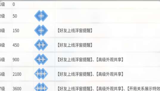 亲密度数值的不同还能够让大家领取到不同的特权,比如说自己和好友的亲密度到了3级以后,好友在上线时,我方这里就能够出现浮窗提醒,若是亲密度升级到5级还能够解锁高级外观共享功能以及各种特效,这样子,玩家就能够和好友共享角色的外观了。