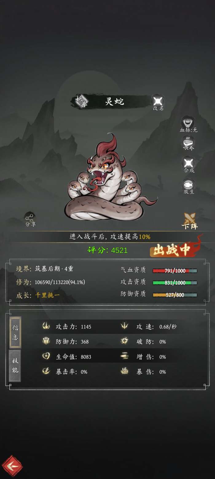 金丹期以前推荐千里挑一以上的灵蛇,其他红色也可以先用,灵蛇攻速快,攻速越大,打的越快