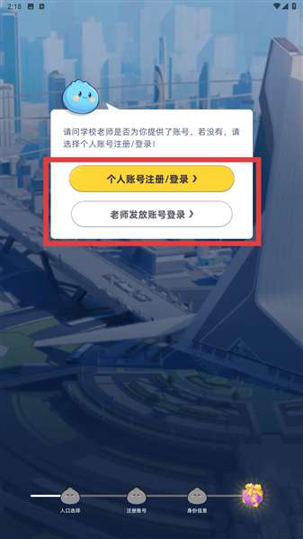2、依据是否有老师提供账号,选择【个人账号注册/登录】或者【老师发放账号登录】。