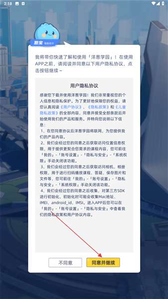 1、在隐私协议页面点击【同意并继续】按钮,即可进入账号选择环节。