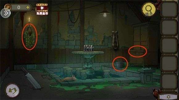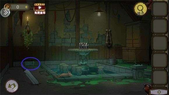 解开“推箱子”机关,到池中间拿到铁箱和火柴。铁桶厨房接水,火柴点燃壁炉,铁箱放上去烤。