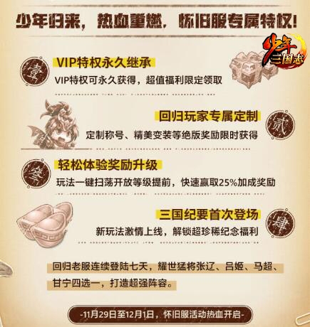 本次老玩家召回活动将于11月29日~12月1日展开,在此期间,“怀旧服”将同步开启。怀旧服在与热血服类似的VIP继承等规则的基础上,增加了专属活动“三国纪要”,怀旧服玩家可以通过达成对应条件,解锁并领取回归专属头像框、炫酷气泡框、定制称号、精美变装以及官邸皮肤等限定装饰,积极参与副本、叛军等玩法,还将获得25%的玩法奖励加成!