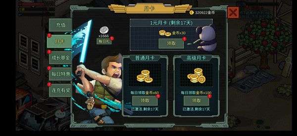 不管啥游戏,基本上月卡不超性价比最该的,但一定是比较高的那一批。所以对于我们微氪玩家来说,要氪金的最优先选择自然就是月卡。首先是主界面的金币月卡,1元月卡,每天可以领30个金币,一个月900个,跟正常比例1:10比起来,性价比不要太高!然后下面的普通月卡和高级月卡的性价比也很高,毕竟金币在像素危城是硬通货,建议购买~